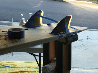 Before glassing, I filled in some valleys on the rail of the board. There were a few places where sanding pulled away parts of the bead and cove strip and/or I failed to get a good clamp on. I taped around these areas and filled them in with epoxy. This was a good way to get experience mixing and applying the epoxy in a small enough area that it wouldn't mess with the whole board. After an hour or two I then began the rest of the board. Brad suggested to let it harded and then sand it, but I waited just long enough for it to stay in the crack when I put it back to horizontal so that it would bond to the next coat of glass. It seemed to work.