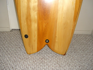 Second, I had a few dings on the top of the board. Rather than sanding these smooth, I put epoxy on them first then laid the glass over top, just like you do with the grain surfboard graphic (or your own depending on what you do). This ensure there is enough epoxy to fill the ding and bond with the fiberglass. Otherwise, enough epoxy may not drip through the glass and you are left with either a dent or a white spot. It should be noted that this method does allow you to see the ding. It shows a different wood color/grain when you follow this method. However, I feel it gives the board some character. Just like an antique piece of furniture, the many dings, dents and patches I have on the board add to the character and make it evident that this was a real project, something I created in my garage and not something pressed out by a machine in China. I'm thrilled with the results.