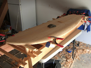 Next I'll dismantle the rocker table and build it into a shaping stand to shape the rails and then to glass the board. I can almost see the finish line.