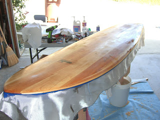 So, unfortunately life caught up with me. I was one coat of resin from being finished. Unfortunately, there was one area near the tail that I was not thrilled with as well as some area around the fin plugs. I was leaving for training at my new job the next day. I decided it was more important to fix the problems and than to get finished before I left, so I applied some resin to the parts I needed to fix and called it a summer. That was three weeks ago. Since then, I've survived the hustle and bustle of Los Angeles for a week, visit San Jose and finally spent the last two weeks in the hottest place on earth, Scottsdale Arizona. I plan to finish up the board in the next week and will be posting some pictures soon.